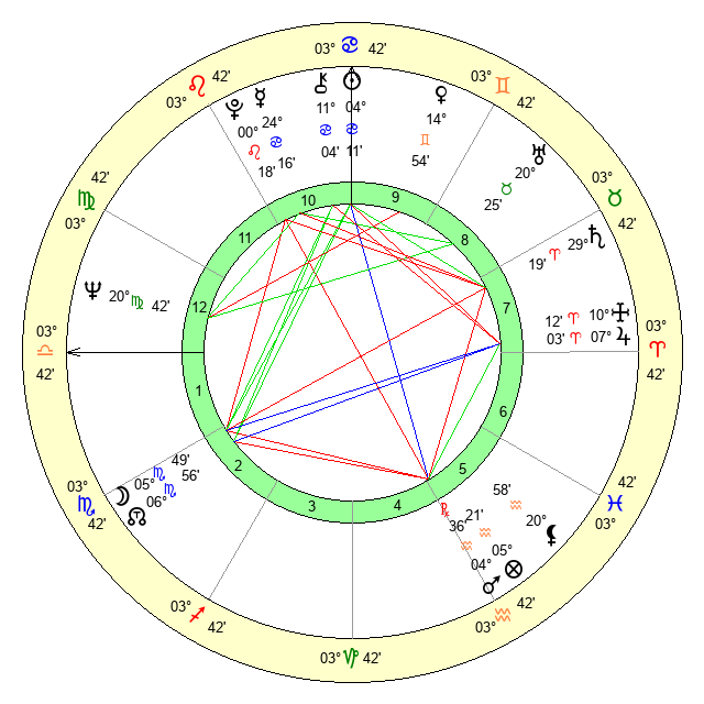 | Mercury | 24 Cancer 16 | 29 Cancer 53 | 25 Virgo 13 |