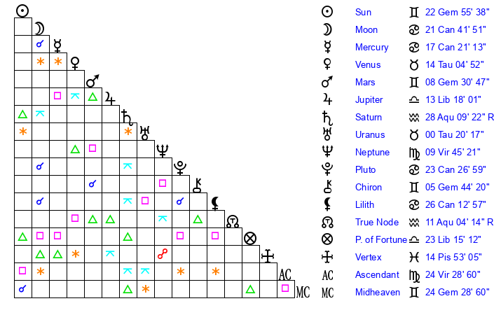 | Sun | 22 Gemini 55 | 23 Gemini 53 | 20 Virgo 12 |