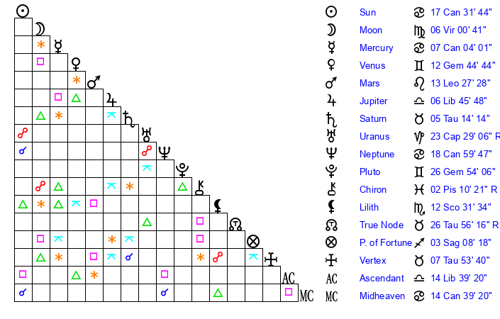 | Pluto | 26 Gemini 54 | 2 Aquarius 55 | 27 Gemini 43 |