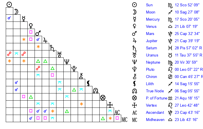 | Sun | 12 Scorpio 52 | 13 Scorpio 32 | 12 Aquarius 11 |
