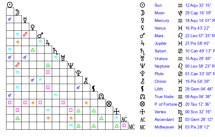 | Sun | 12 Aquarius 32 | 14 Aquarius 6 | 0 Gemini 16 |