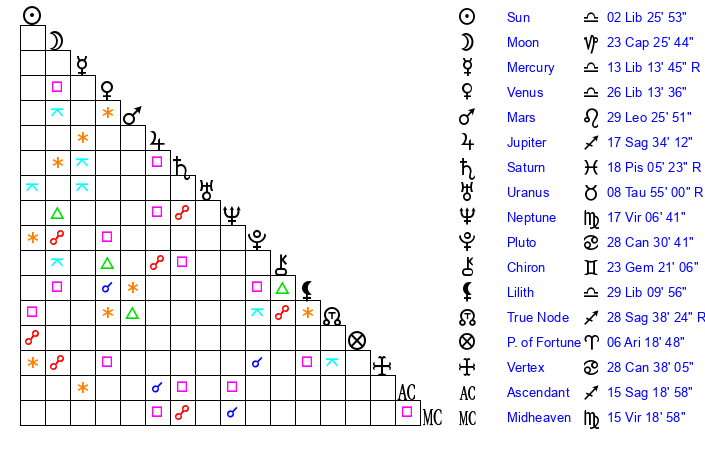 | Venus | 26 Libra 14 | 7 Virgo 34 | 14 Aquarius 21 |