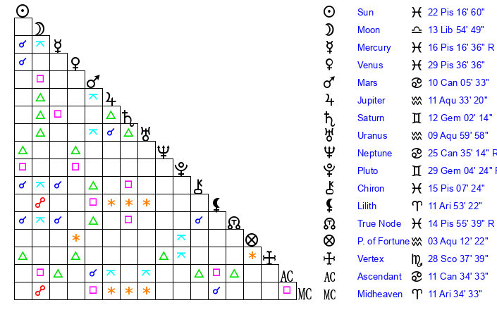 | Sun | 22 Pisces 17 | 23 Pisces 22 | 9 Cancer 56 |
