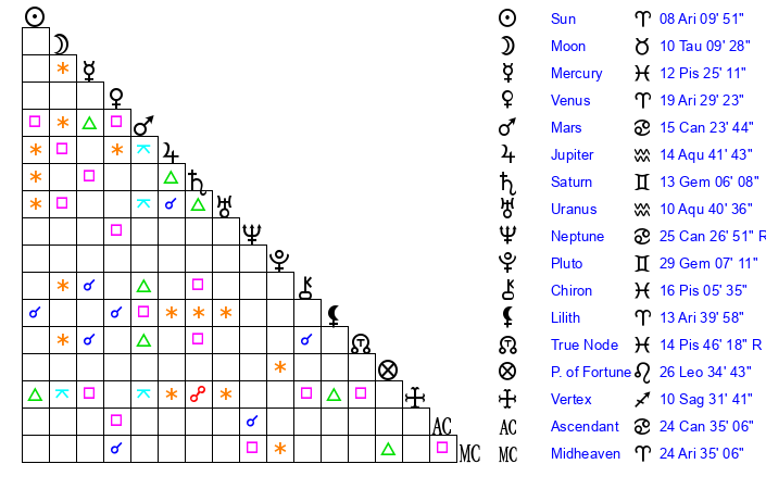 | Saturn | 13 Gemini 46 | 24 Pisces 8 | 26 Gemini 47 |