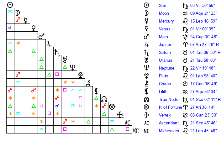 | Moon | 9 Aquarius 21 | 25 Libra 50 | 28 Pisces 16 |