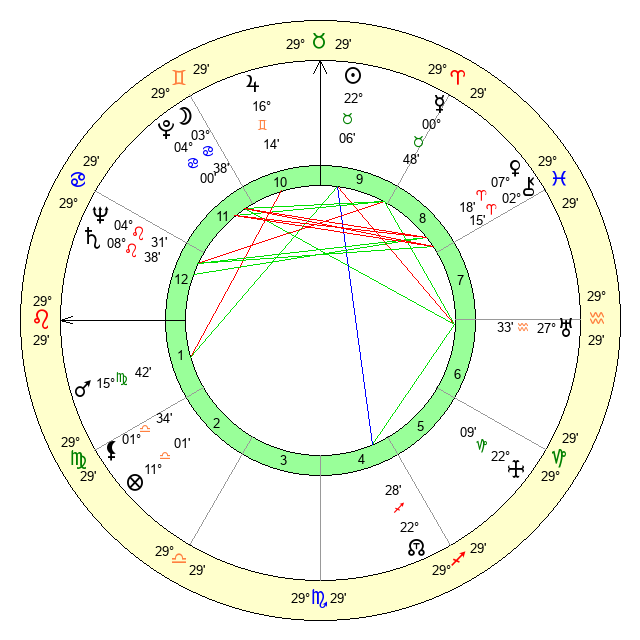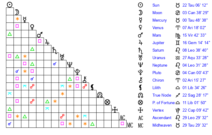 | Sun | 22 Taurus 6 | 23 Taurus 11 | 4 Virgo 33 |