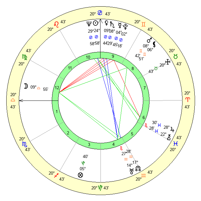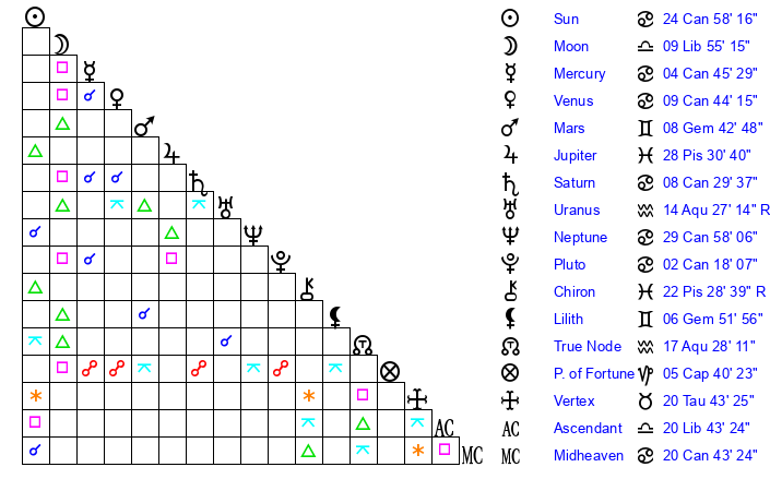 | Sun | 24 Cancer 58 | 26 Cancer 19 | 12 Scorpio 12 |