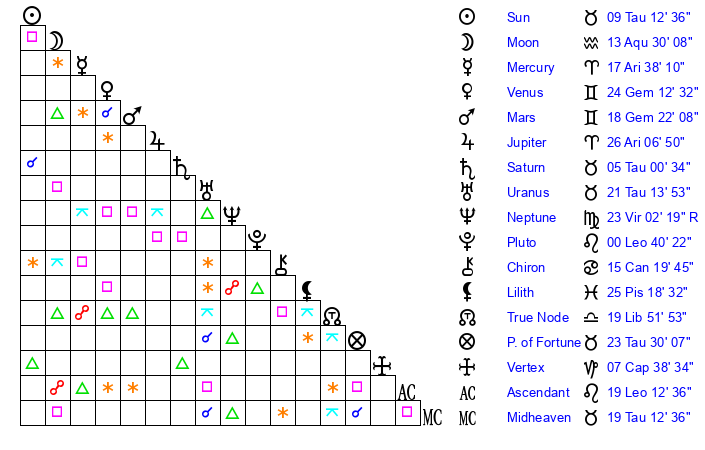 | Saturn | 5 Taurus 9 | 27 Pisces 37 | 13 Taurus 55 |