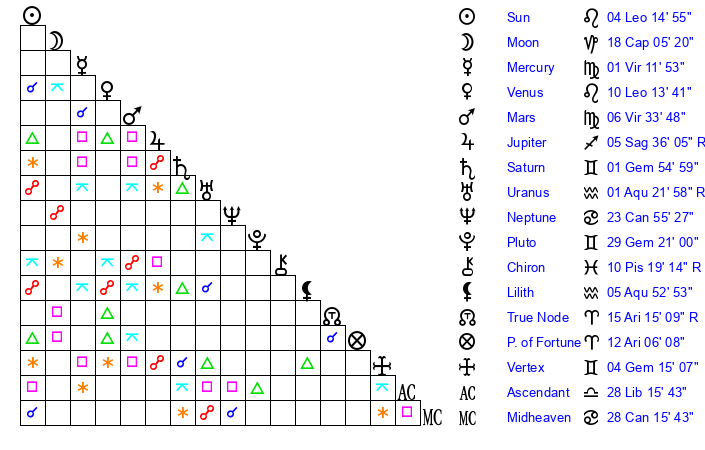 | Venus | 10 Leo 14 | 26 Gemini 1 | 29 Sagittarius 23 |