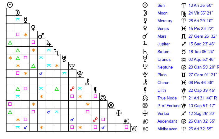 | Sun | 10 Aries 37 | 11 Aries 14 | 29 Cancer 28 |