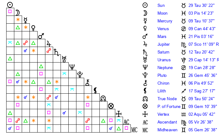 | Moon | 3 Pisces 2 | 16 Pisces 12 | 9 Taurus 11 |