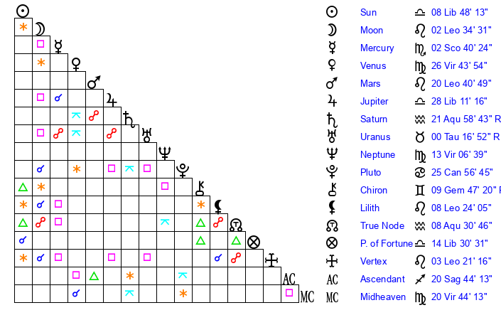 | Moon | 2 Leo 39 | 11 Aquarius 25 | 23 Scorpio 22 |
