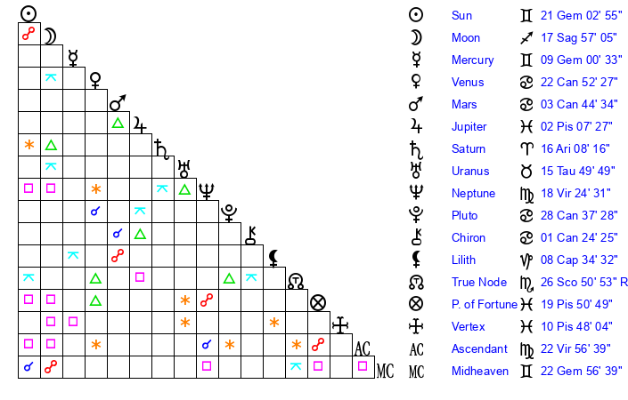 | Sun | 21 Gemini 3 | 21 Gemini 58 | 14 Virgo 24 |