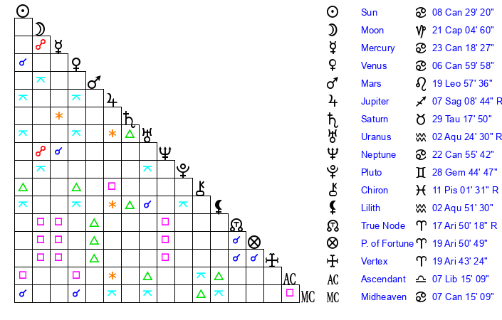| Neptune | 22 Cancer 56 | 2 Aries 10 | 26 Cancer 0 |