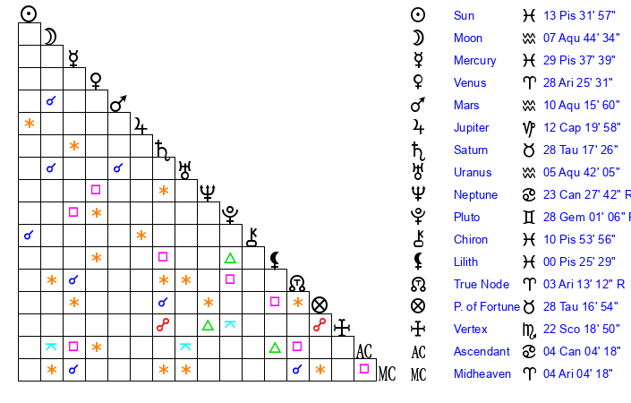 | Sun | 13 Pisces 32 | 14 Pisces 22 | 2 Cancer 32 |