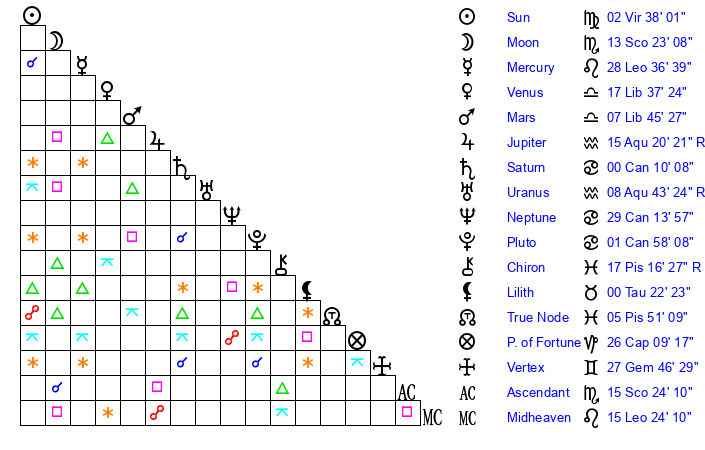 | Venus | 17 Libra 37 | 1 Leo 16 | 27 Scorpio 5 |
