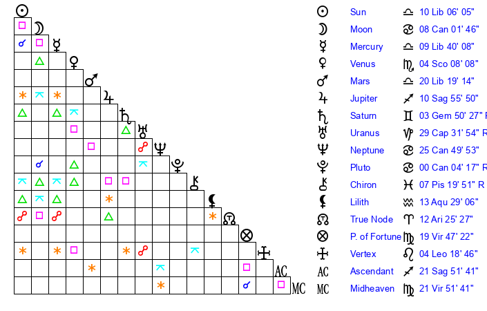 | Venus | 4 Scorpio 9 | 17 Virgo 24 | 19 Pisces 54 |