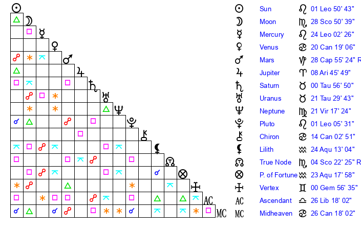 | Pluto | 1 Leo 6 | 2 Aquarius 34 | 2 Leo 52 |
