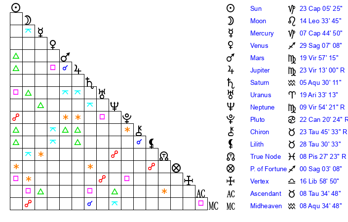 | Neptune | 9 Virgo 54 | 27 Pisces 30 | 7 Virgo 40 |