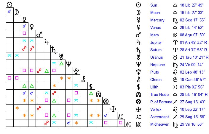 | Moon | 16 Libra 25 | 5 Cancer 58 | 11 Sagittarius 19 |