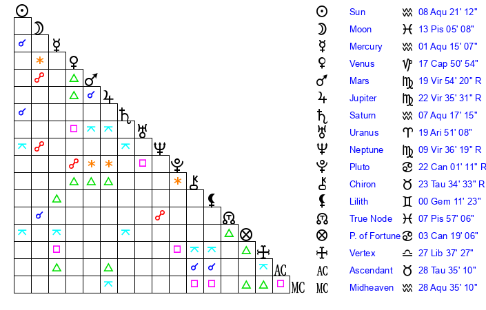 | Saturn | 7 Aquarius 28 | 17 Pisces 0 | 15 Aquarius 59 |