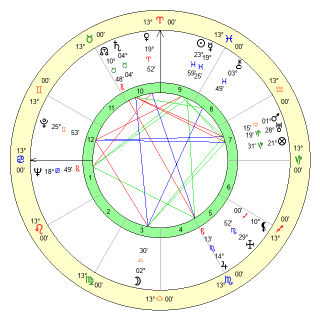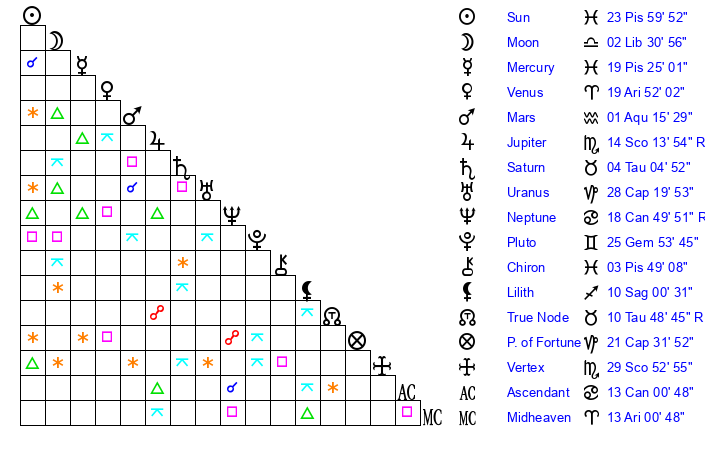 | Sun | 24 Pisces 0 | 25 Pisces 22 | 14 Cancer 26 |