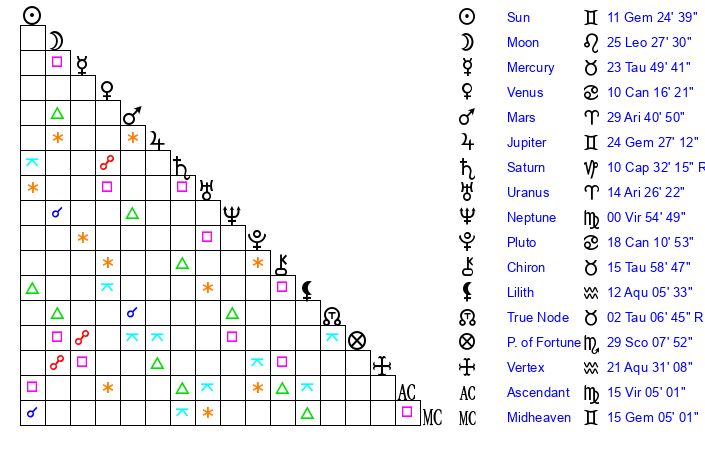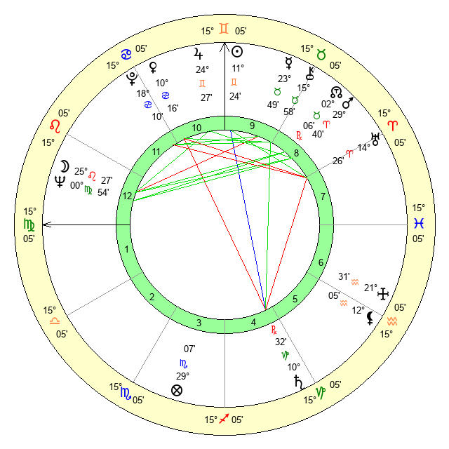 | Sun | 11 Gemini 25 | 12 Gemini 24 | 12 Virgo 23 |