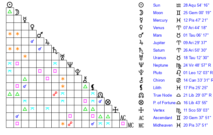 | Sun | 28 Aquarius 54 | 0 Pisces 17 | 22 Taurus 45 |
