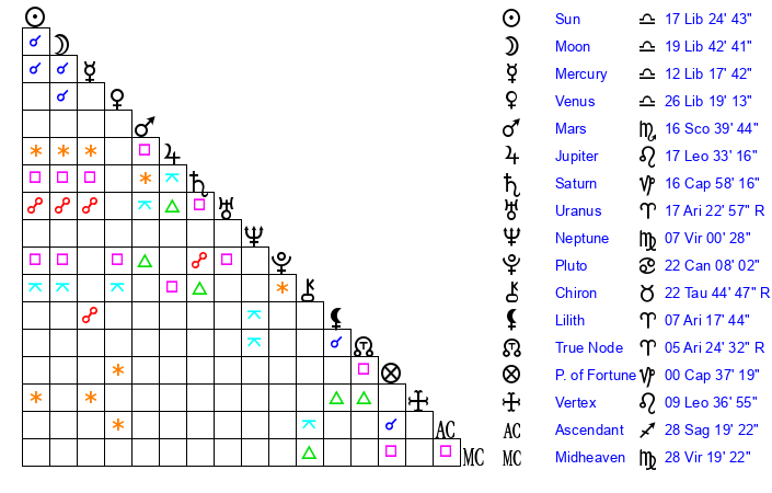| Neptune | 5 Virgo 38 | 27 Pisces 18 | 3 Virgo 23 |