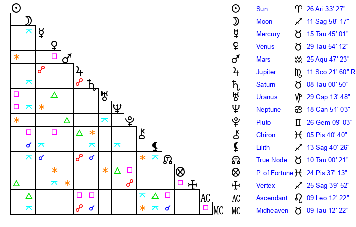 | Sun | 26 Aries 34 | 27 Aries 56 | 15 Leo 58 |