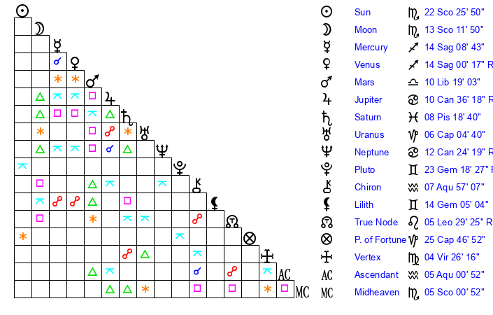 | Venus | 14 Sagittarius 0 | 10 Scorpio 59 | 8 Aquarius 51 |