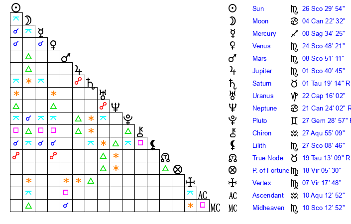 | Venus | 24 Scorpio 49 | 16 Scorpio 0 | 18 Aries 39 |