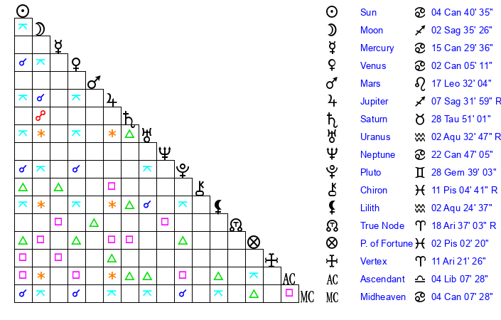 | Moon | 2 Sagittarius 30 | 22 Cancer 20 | 19 Capricorn 58 |