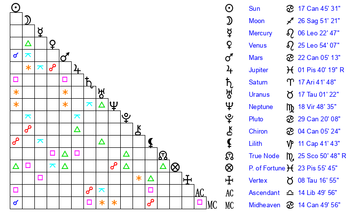 | Moon | 26 Sagittarius 49 | 16 Capricorn 59 | 28 Aquarius 14 |