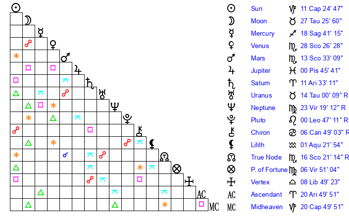 | Mercury | 18 Sagittarius 41 | 1 Capricorn 16 | 15 Aries 23 |
