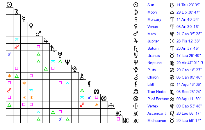 | Moon | 29 Libra 36 | 19 Cancer 42 | 23 Sagittarius 51 |
