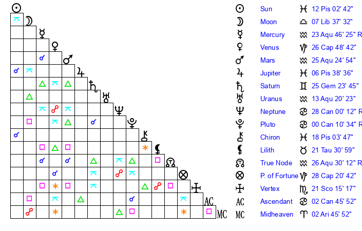 | Sun | 12 Pisces 2 | 13 Pisces 22 | 29 Gemini 13 |