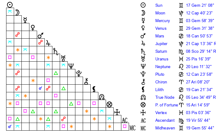 | Mercury | 3 Gemini 59 | 29 Gemini 30 | 7 Virgo 6 |