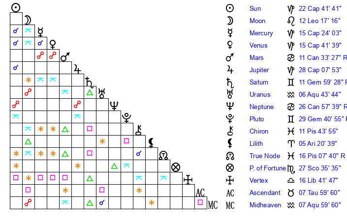| Sun | 22 Capricorn 41 | 23 Capricorn 31 | 14 Taurus 20 |