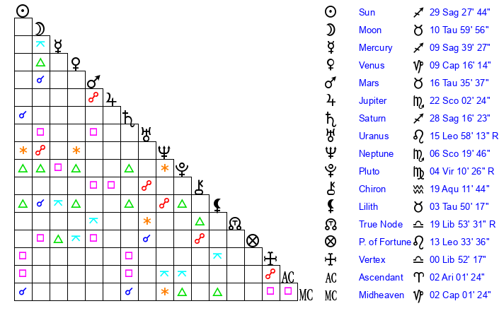 | Neptune | 6 Scorpio 19 | 27 Pisces 11 | 6 Scorpio 51 |