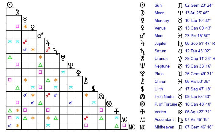 | Pluto | 26 Gemini 49 | 3 Aquarius 43 | 28 Gemini 58 |