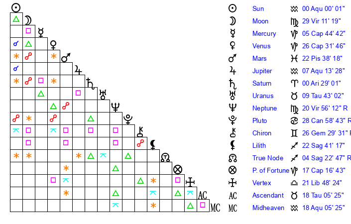 | Sun | 0 Aquarius 0 | 0 Aquarius 53 | 27 Aries 1 |
