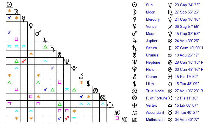 | Sun | 20 Capricorn 24 | 21 Capricorn 29 | 11 Taurus 12 |