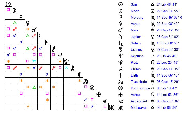 | Neptune | 25 Libra 46 | 0 Aries 4 | 27 Libra 57 |
