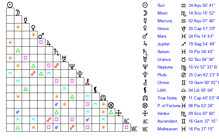 | Sun | 24 Aquarius 50 | 26 Aquarius 15 | 22 Taurus 43 |