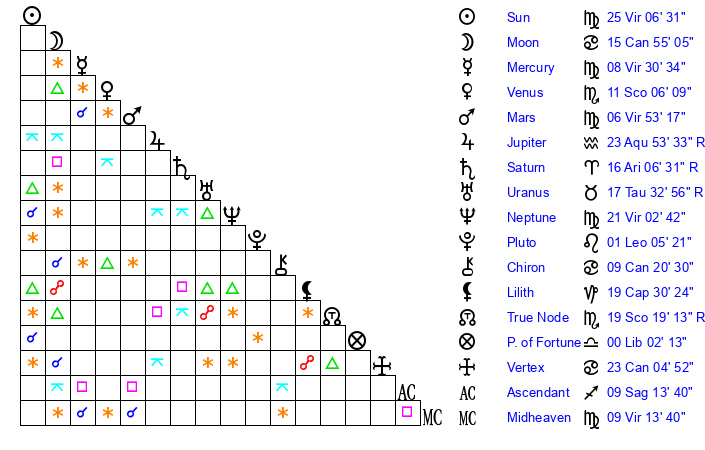 | Sun | 25 Virgo 6 | 26 Virgo 2 | 22 Sagittarius 3 |