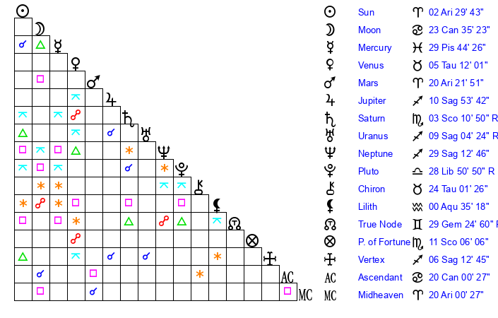 | Jupiter | 10 Sagittarius 44 | 14 Gemini 46 | 8 Sagittarius 39 |