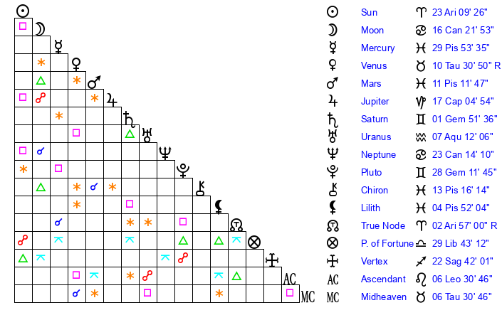 | Venus | 10 Taurus 30 | 24 Pisces 39 | 27 Gemini 30 |