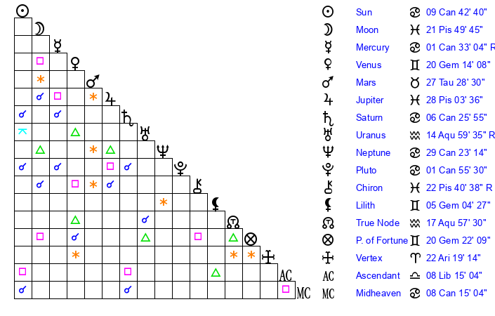 | Neptune | 29 Cancer 24 | 2 Aries 10 | 2 Leo 36 |