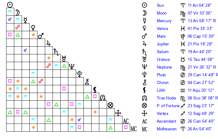 | Saturn | 19 Aries 51 | 24 Pisces 29 | 29 Aries 28 |